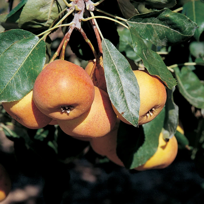 Large delectable fruits! A hybrid of mountain ash and pear, attractive trees produce round, yellow-orange fruits the size of large apricots. The mouth-watering, seedless fruits are aromatic with a slight, rose-like scent. The trees have attractive, dark silvery green foliage and nice pyramidal shape. Hardy and scab resistant. partially self-fruitful, but more fruit will set with cross-pollination. Plant with other Mountain Ash varieties or early blooming European Pears like Ubileen or Clapps’s Favorite Ht: 15-20′